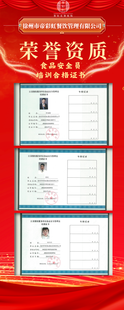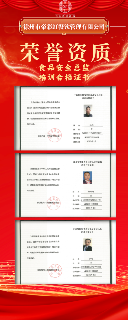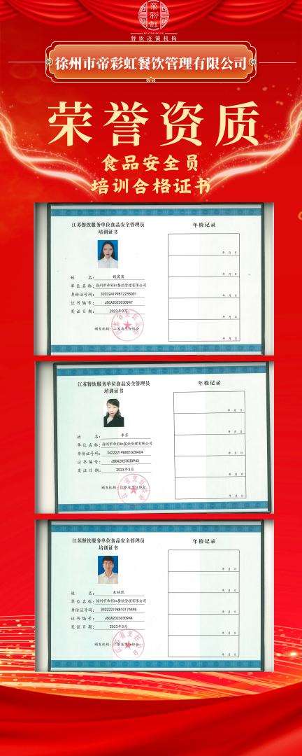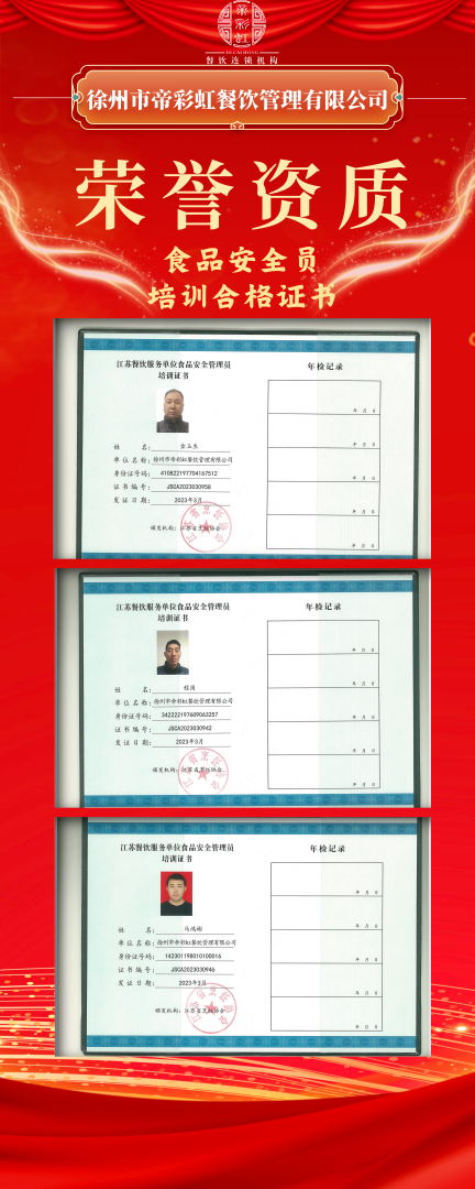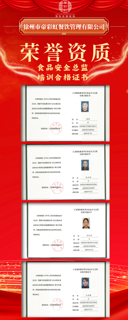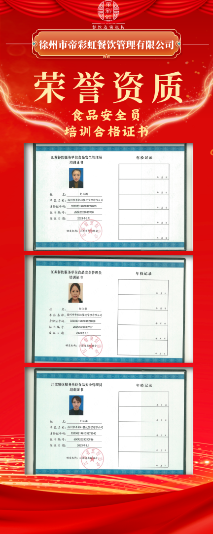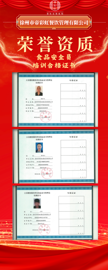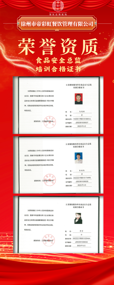 為增強各項目部管理人員的食品安全意識及責任意識,我公司各項目經(jīng)理通過專業(yè)能力考試獲得江蘇省烹飪協(xié)會頒發(fā)的“食品安全管理員”15人、“食品安全總監(jiān)”11人培訓(xùn)合格專業(yè)技能證書。
